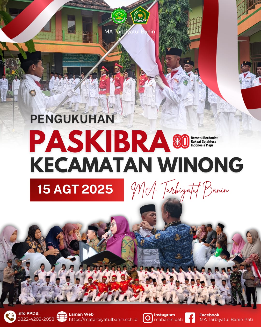 Kecamatan Winong sukses menyelenggarakan acara pengukuhan Pasukan Pengibar Bendera (Paskibra) pada Jumat, 15 Agustus 2025 bertempat di MA Tarbiyatul Banin, Pati. Kegiatan ini berlangsung meriah dengan dihadiri oleh Peserta Pengukuhan, perangkat daerah, serta sejumlah unsur TNI dan Polri yang turut memberikan dukungan penuh.