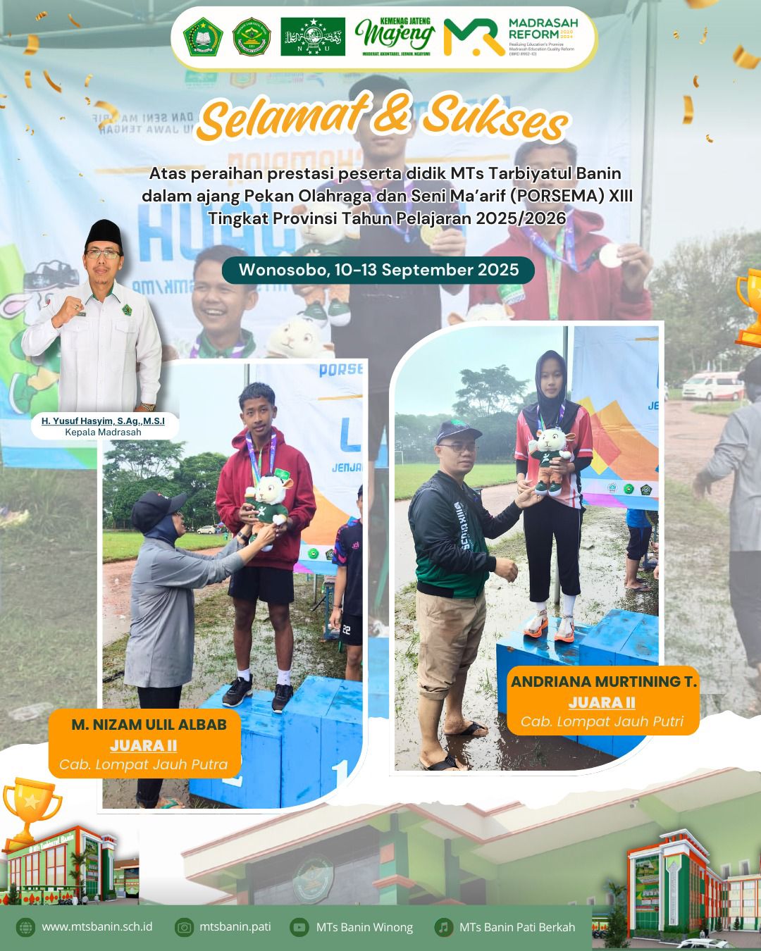 Dua peserta didik MTs Tarbiyatul Banin kembali menorehkan prestasi membanggakan dalam ajang Pekan Olahraga dan Seni Ma’arif (PORSEMA) XIII Tingkat Provinsi Jawa Tengah Tahun Pelajaran 2025/2026 yang digelar di Wonosobo pada tanggal 10-13 September 2025. Dalam ajang kompetisi olahraga dan seni tahunan ini, siswa-siswi MTs Tarbiyatul Banin berhasil meraih posisi juara pada cabang olahraga lompat jauh.