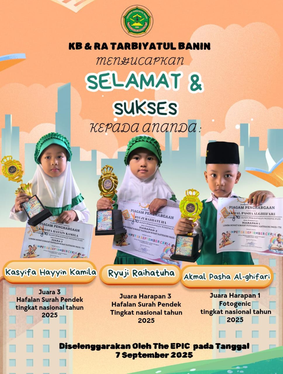 dalam ajang perlombaan The EPIC September 2025, siswa siswi KB&RA Tarbiyatul Banin Meraih prestasi yang membanggakan.