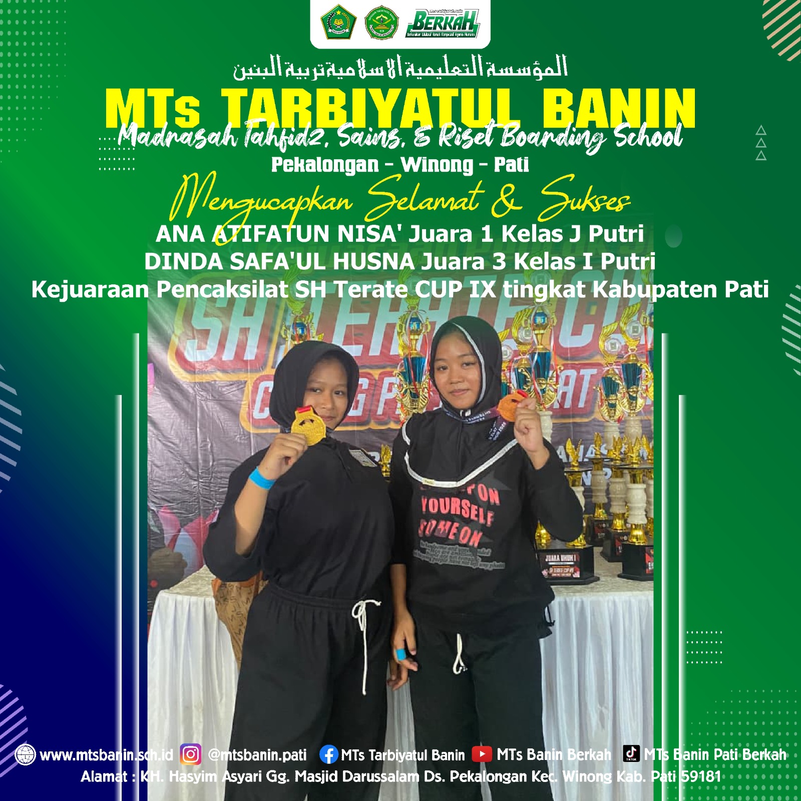 MTs Tarbiyatul Banin, Madrasah Tahfidz, Sains, & Riset Boarding School yang berlokasi di Pekalongan – Winong – Pati, kembali menorehkan prestasi membanggakan melalui dua siswinya, Ana Atifatun Nisa’ dan Dinda Safa’ul Husna. Mereka berhasil meraih medali di Kejuaraan Pencak Silat SH Terate CUP IX tingkat Kabupaten Pati.